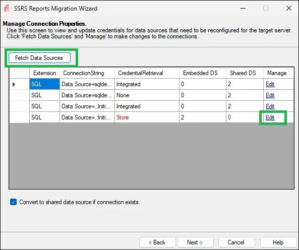 On this screen, click the Fetch Data Sources button. The wizard will scan the selected SSRS items (from the previous screen) and populate a grid with all connections that can be updated.