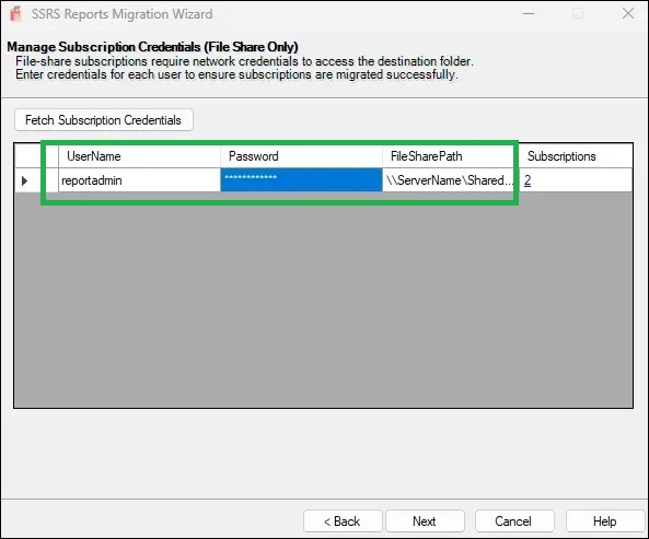 Since SSRS does not return stored passwords for file-share subscriptions, the wizard provides a screen to collect network credentials required to successfully recreate these subscriptions on the target server.